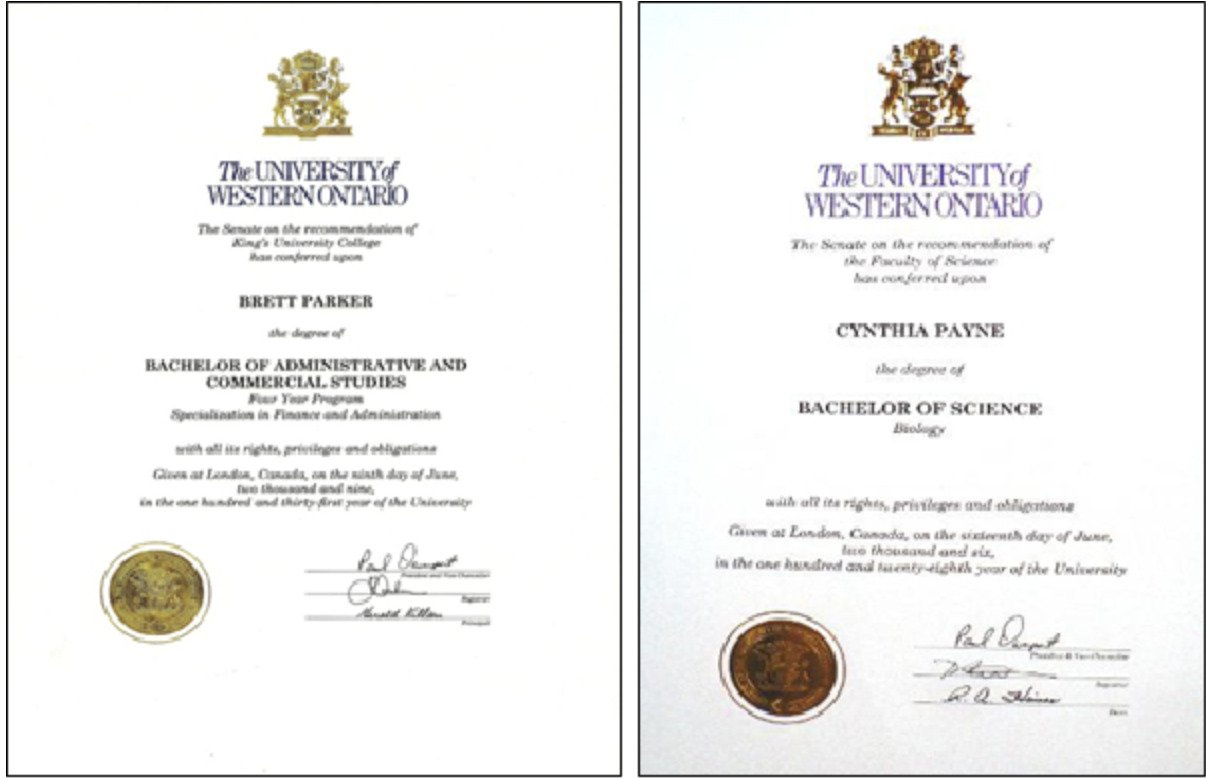 Bằng tốt nghiệp từ Học viện Đại học King’s VÀ Bằng tốt nghiệp từ chuyên khoa Tự nhiên của Western Ontario.