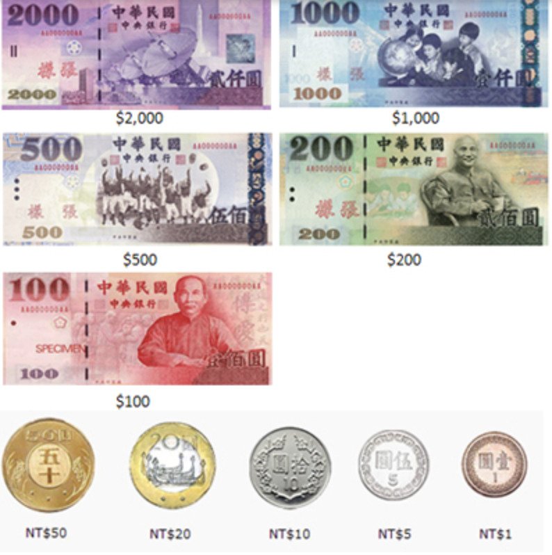 Tiền Đài Loan (TWD) được chia thành nhiều mệnh giá khác nhau, bao gồm đồng xu và giấy tiền.